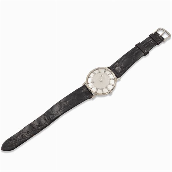 cassa tonda 33 mm. in oro bianco 14kt, quadrante bianco, indici con diamanti taglio brillante, movimento meccanico a carica manuale, calibro Jager Le Coultre 480, cinturino in pelle con fibbia in metallo, cassa, quadrante e movimento firmati, lievi difetti,