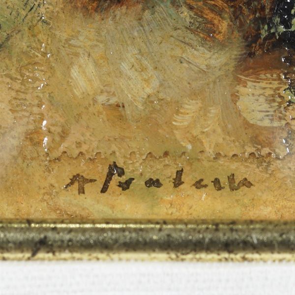 "Bosco", olio su cartone firmato in basso a sinistra, entro cornice, 10x14 cm.
