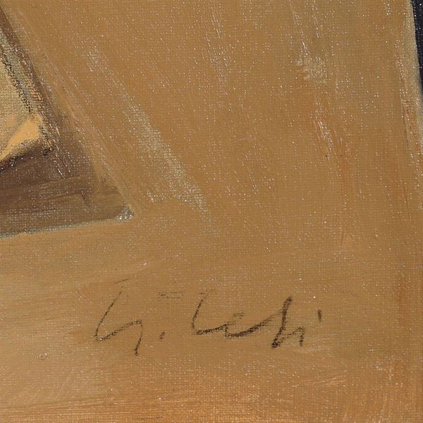 "Composizione con valigia", 1990, olio su tavoletta, firmato in basso a destra, entro cornice, 70x90 cm.