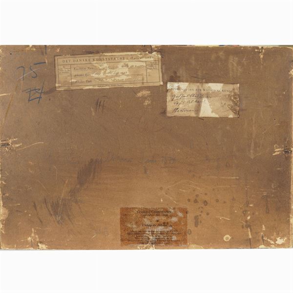 "Veduta da Albano Laziale", olio su cartoncino riportato su cartone, siglato e datato 1874 in basso a destra, entro cornice in legno dorato, 31x44 cm.