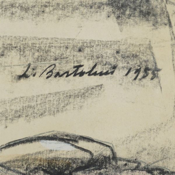 "Paesaggio al tramonto", 1955, pastello su carta, firmato e datato in alto a destra, entro cornice, 26x32 cm.