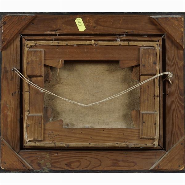"Paesaggio", olio su carta applicata su tela, firmato in basso a sinistra, entro cornice, 18,5x23,5 cm.