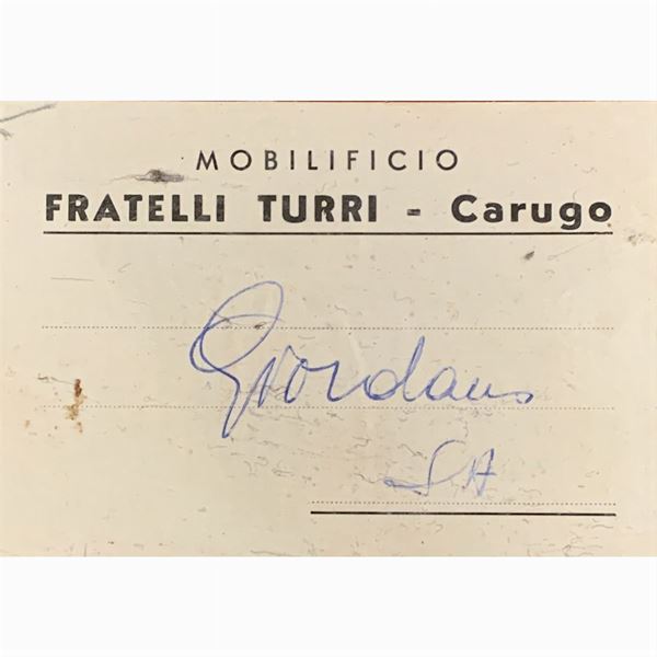 tavolo in legno e ottone, piano in marmo restaurato, etichetta della produzione, 77x190x90 cm.