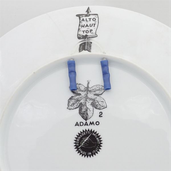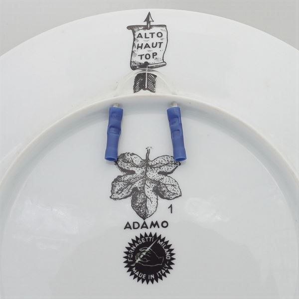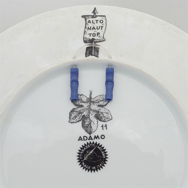 dodici piatti serie Adamo in ceramica su fondo oro, sul retro marchio della produzione con numero, d. 26 cm.