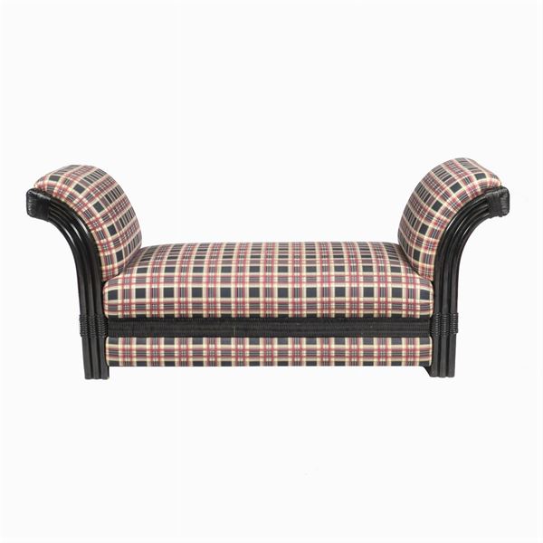 panca in bambù, rattan e tessuto imbottito, 73x165x55 cm.