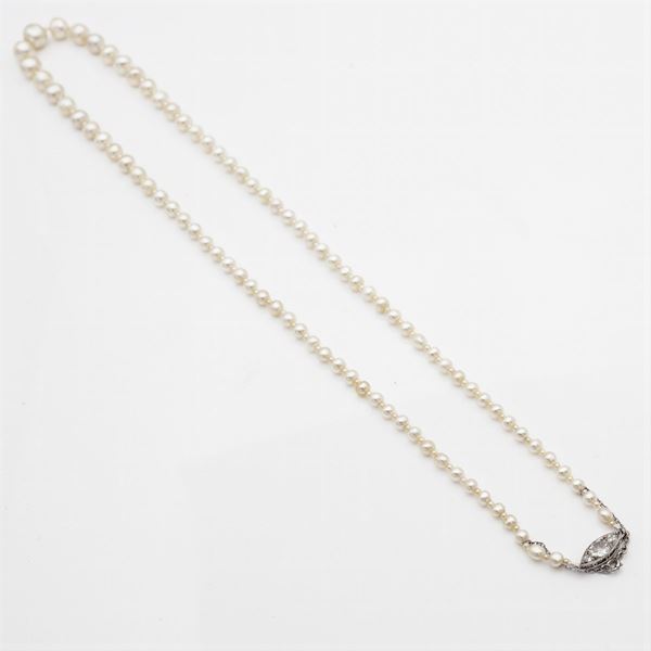 disposte a gradazione da 3,2 mm. a 7,7 mm. alternate da perline, chiusura in platino e tre diamanti taglio vecchio ct 0,90 circa, lunghezza 48 cm. entro astuccio originale