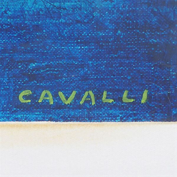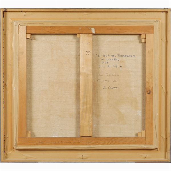 "Isola del Purgatorio in Lipari", 1969, olio su tela, firmato in basso a destra e sul retro, entro cornice, 70x62 cm.