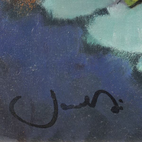 "Natura morta con frutta, vasellame e bottiglie", olio su tela, firmato in basso a destra, entro cornice, 50x70 cm.