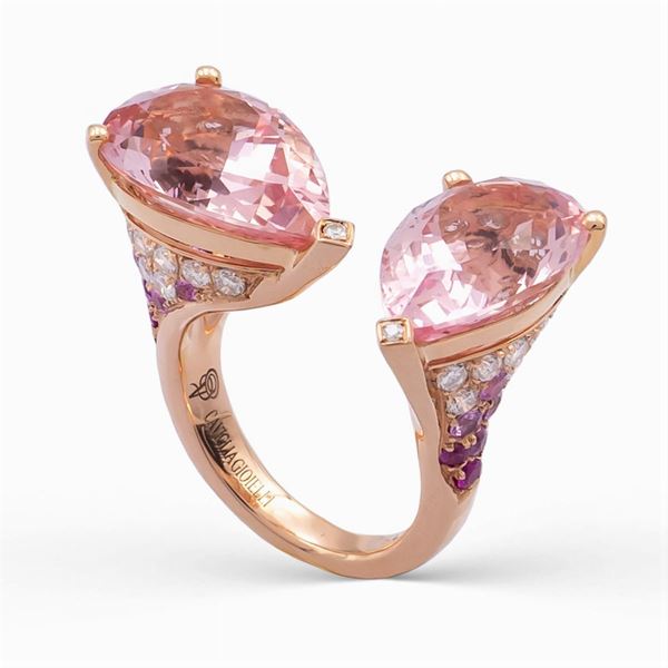 Anello contrarié in oro rosa 18kt e due morganiti rosa ct 11,80
