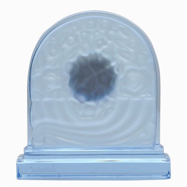 7,6x7x2,5 cm.in cristallo nella tonalità dell'azzurro, cassa tonda, quadrante bianco con numeri arabi, movimento al quarzo