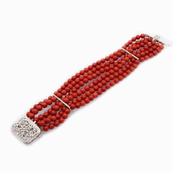 peso 58,9 gr.composto da sei fili di corallo rosso a sfere 5,5 mm. circa alternati da barrette in oro bianco con incastonati diamanti taglio huit-huit, chiusura - pendente removibile in oro bianco 18kt e diamanti taglio huit-huit lunghezza 18 cm.