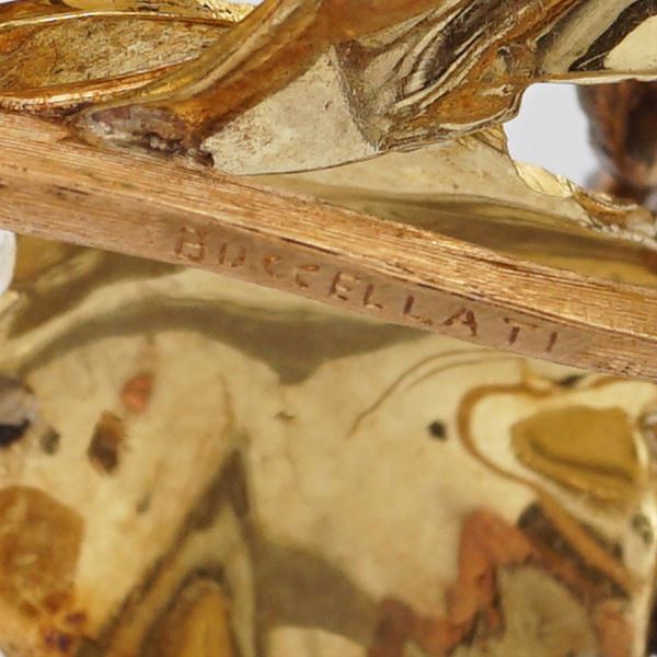 peso 12,6 gr.montata in oro a due colori 18kt e argento con perla barocca e rose di diamanti, firmata sul retro, misure 4,5x3 cm.