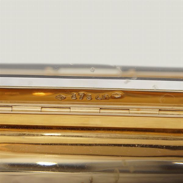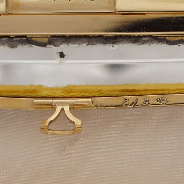 peso 263 gr.in oro giallo 18kt con stesura in smalto guilloché nella tonalità del rosa, all'interno portacipria con specchietto, chiusura a scatto in oro bianco e diamanti taglio brillante, firmata e numerata all'interno n. 879, misure 8x7 cm.