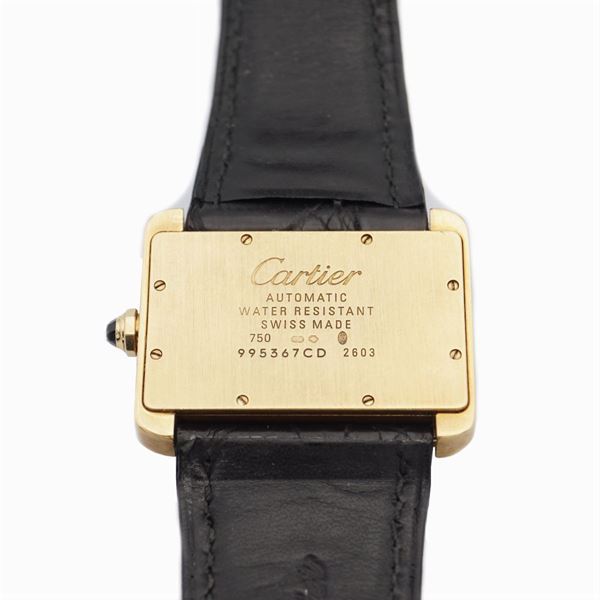 in oro giallo 18kt, cassa rettangolare 38x30 mm. ref. 2603 - 995367CD, lunetta con diamanti taglio brillante ct 2,20 circa, quadrante argentato guilloché con numeri romani, vetro zaffiro, movimento meccanico a carica automatica, calibro Cartier 381A 120, cinturino con fibbia originale in pelle e oro giallo 18kt, cassa quadrante e movimento firmati Completo di scatola