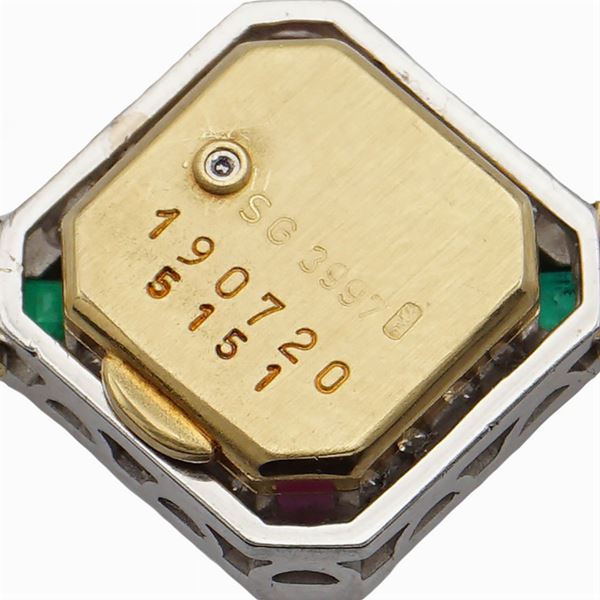 peso 23,6 gr.cassa ottagonale mm. 15x18 mm. ref. SG3997 - 190720 - 5151, quadrante dorato, senza numeri, vetro zaffiro, ghiera con diamanti, rubini e smeraldi, movimento al quarzo Eta 201001, bracciale in oro giallo 18kt con doppia riviere di diamanti taglio brillante ct 2 circa alternati da rubini, zaffiri e smeraldi taglio carré, firmato sulla chiusura, cassa quadrante e movimento firmati, lunghezza 17 cm.