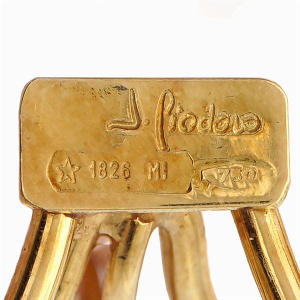 montato in oro giallo 18kt e centrato da quattro zaffiri taglio ovale briolet ct 3 circa, misura 5x5,2 cm. lievi difetti