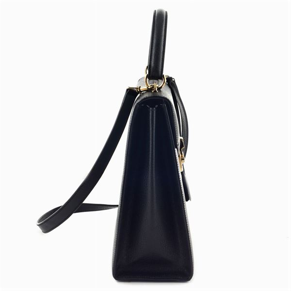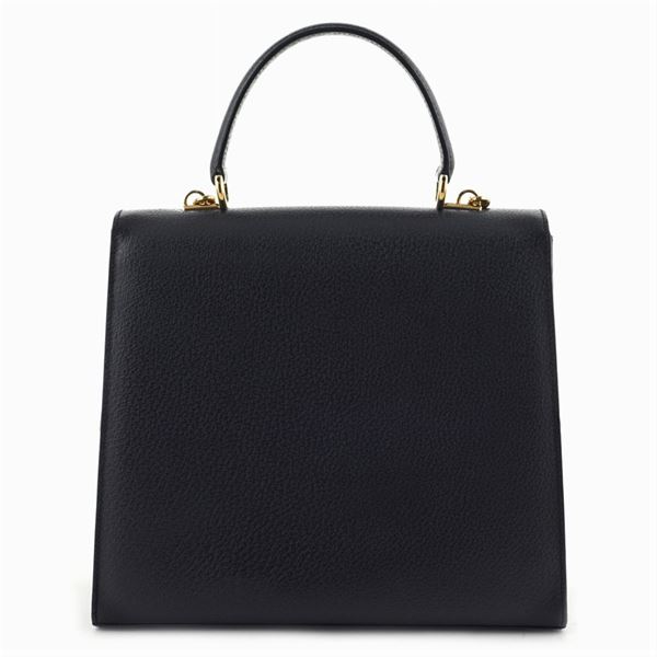 25x28,5x10 cm.in pelle nera, finiture in metallo dorato, con manico e tracolla a spalla, interno ad uno scomparto con tre tasche di cui una a zip, chiusura a lucchetto con chiavi, completa di custodia in tessuto, buone condizioni