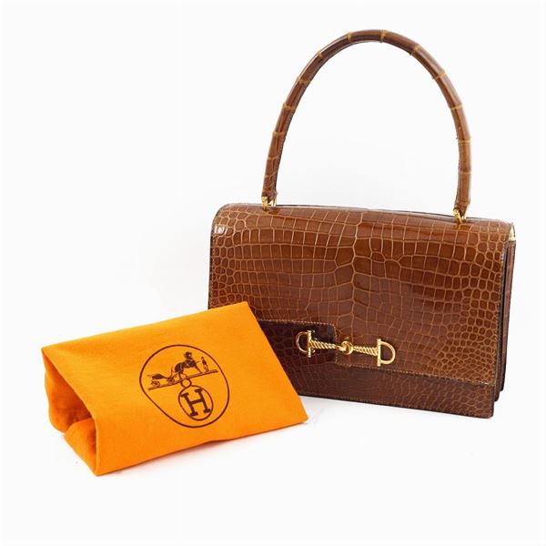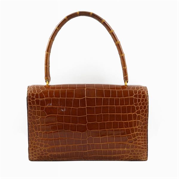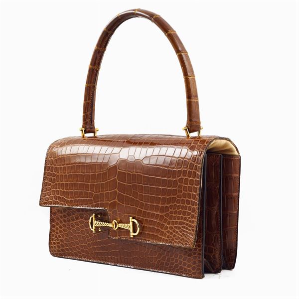 23x16x5,5 cm.in coccodrillo beige con manico, finiture e chiusura a scatto a motivo di staffa in metallo dorato, interno in pelle a due scomparti con quattro tasche e portarossetto, buone condizioni
