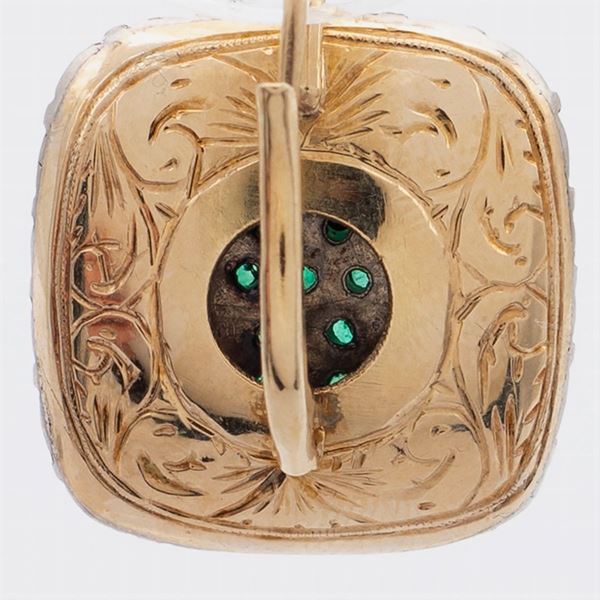 peso 16,5 gr.centrati da smeraldi tondi e rose di diamante, misure 2x2 cm.