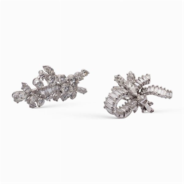 peso 20,5 gr.taglio brillante, baguettes e marquise ct 8 circa disposti a motivo floreale, il pendente è snodabile e removibile, misure 4,5x2 cm.