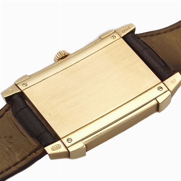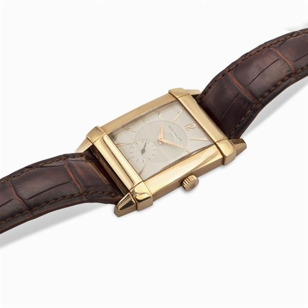 in oro rosa 18kt, cassa rettangolare 36x30 mm. - ref. 5111R, quadrante duodial bianco e argentato, difetti, indici e lancette decò, vetro zaffiro, contasecondi ore 6, movimento meccanico a carica manuale, cinturino con fibbia originale in pelle e oro rosa 18kt
