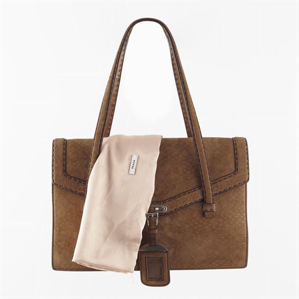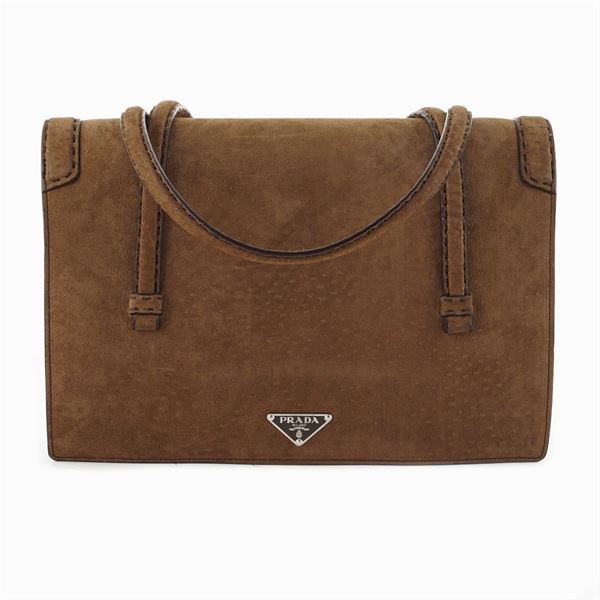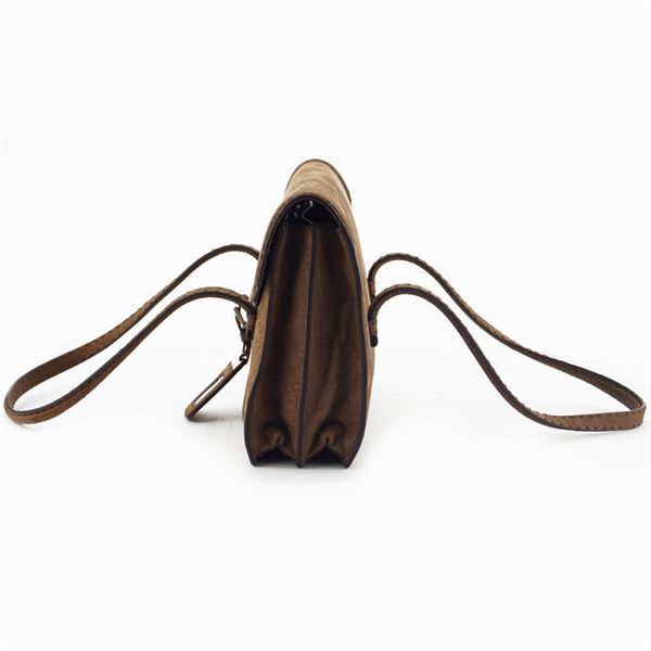19x30x7 cm.in pelle scamosciata, chiusura a scatto, interno in pelle bordeaux a due scomparti con tre tasche, doppio manico, completa di targhetta portanome e custodia in tessuto, buone condizioni
