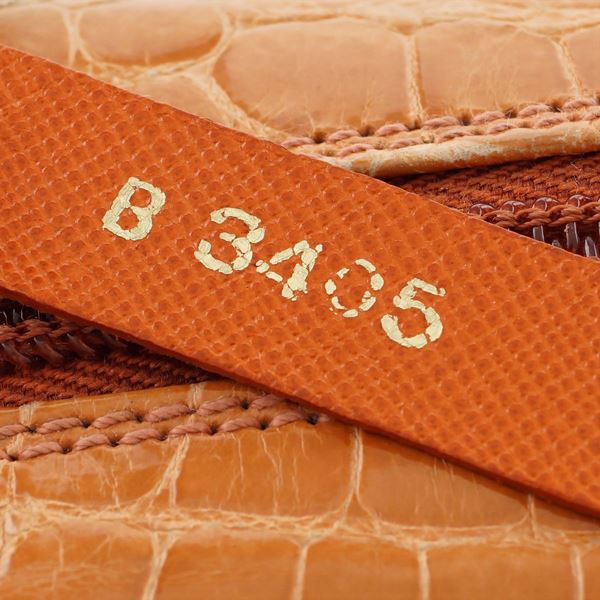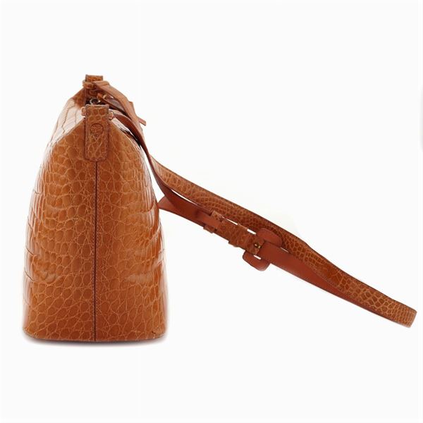 21x28x12 cm.in coccodrillo albicocca, chiusura a cerniera, interno ad uno scomparto in tessuto nero con tasca a zip, tracolla a spalla regolabile, buone condizioni, completa di custodia in tessuto