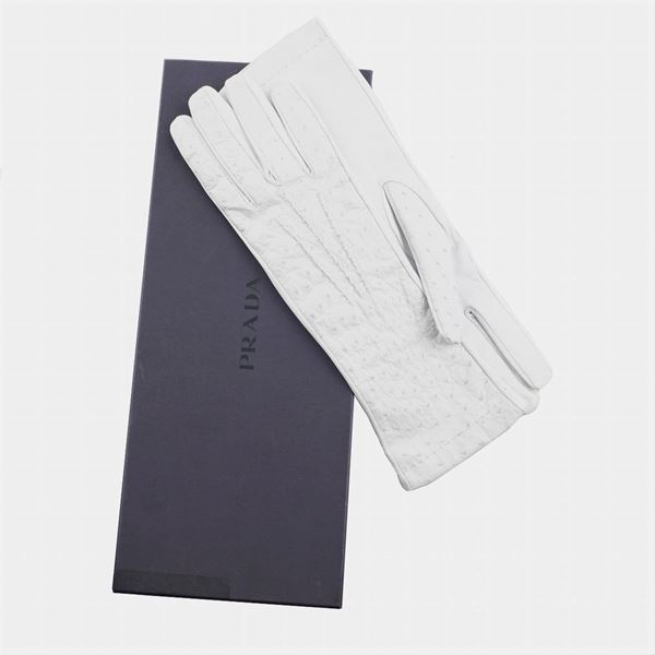 taglia 7,5in pelle di struzzo color talco, interno in seta, completi di scatola, buone condizioni, lunghezza 31,5 cm.