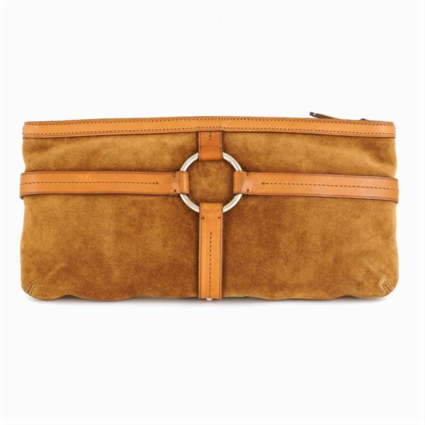 32x15 cm.in pelle scamosciata beige, finiture in pelle centrata da staffa in metallo con logo, chiusura a cerniera, interno ad uno scomparto con tasca, buone condizioni, completa di custodia in tessuto