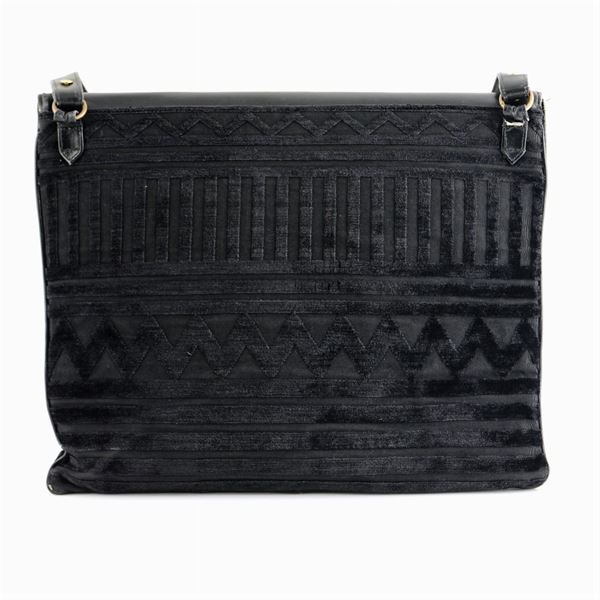 31x25 cm.in tela e velluto nero, finiture, manico e tracolla in pelle nera, chiusura a scatto con logo in metallo dorato, interno in pelle ad uno scomparto con tre tasche di cui una a zip, interno con difetti, tasca esterna