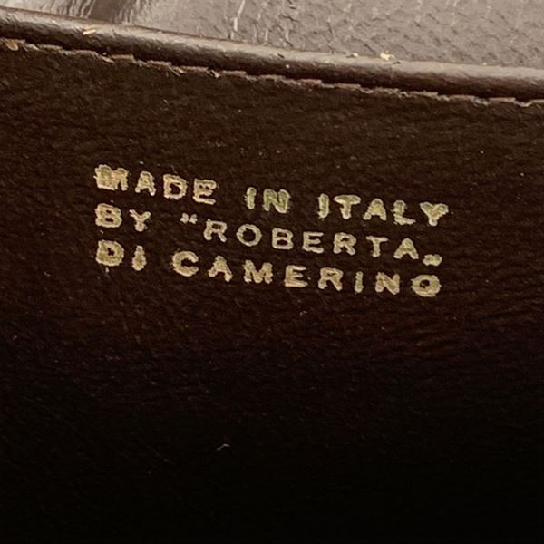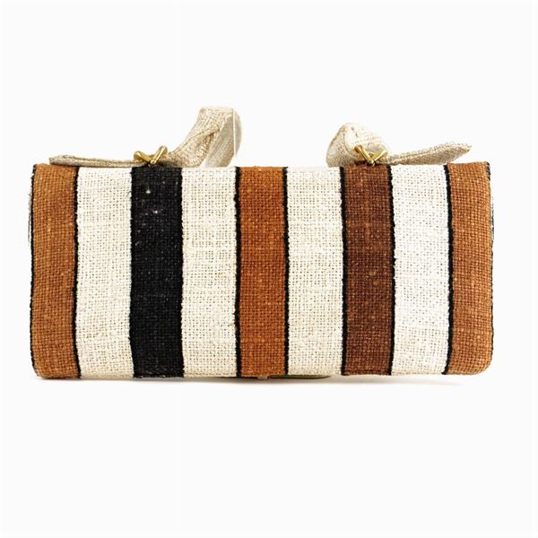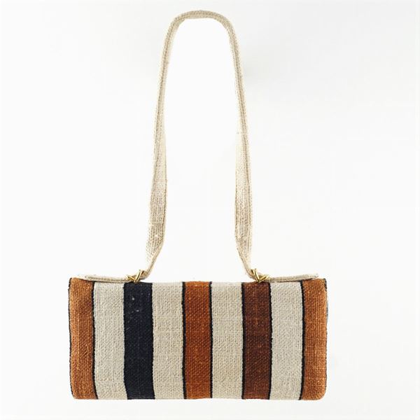 23,5x11,5x2 cm.in tela ecrù e nei toni del marrone, tracolla a spalla, finiture e chiusura a fibbia in metallo dorato, interno in pelle ad uno scomparto con due tasche, buone condizioni