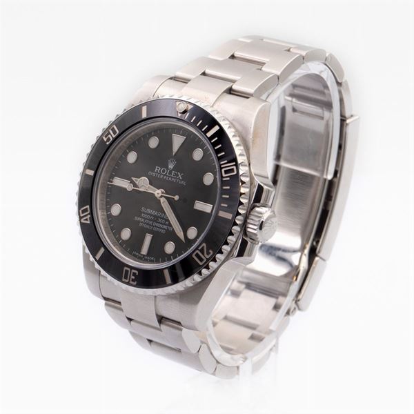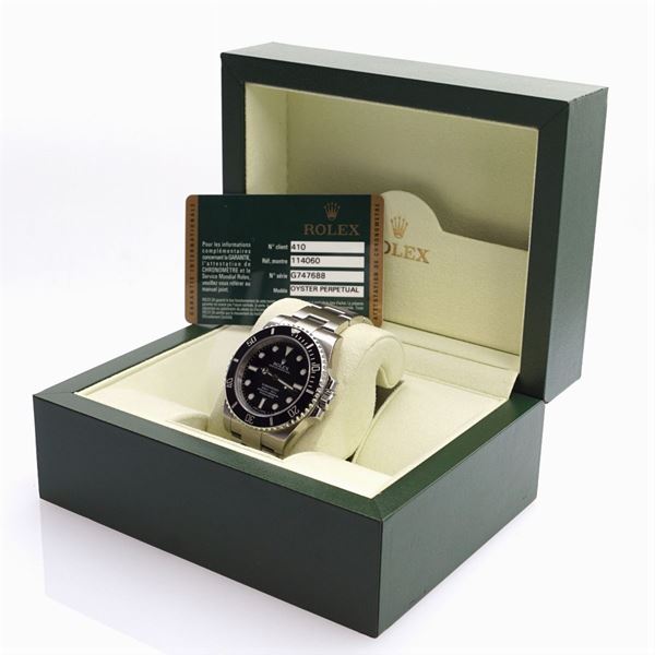 in acciaio ref. 114060, cassa 41 mm.  quadrante nero con indici, lunetta unidirezionale in ceramica, vetro zaffiro, movimento meccanico a carica automatica, serie n. G747688, calibro 3130, riserva di carica 48 h, bracciale oyster in acciaio con chiusura deployante, cassa quadrante e movimento firmati