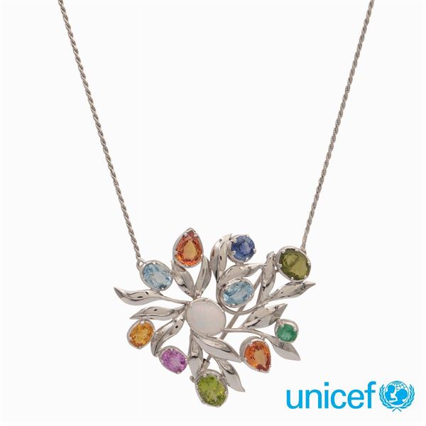 peso 20 gr.centrata da un opale arlecchino taglio ovale cabochon contornato da peridoti, citrini, topazi azzurri, zaffiri blu e rosa e smeraldo taglio ovale e a goccia, completa di collanina in oro bianco 18 kt, lunghezza 46 cm.