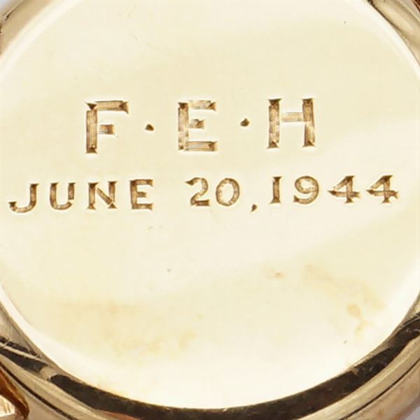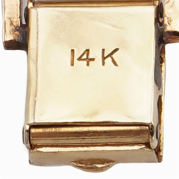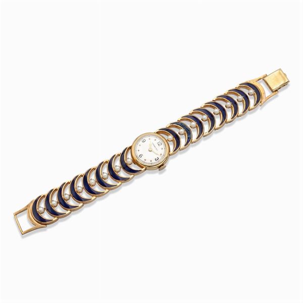 peso 41,9 gr.in oro giallo 14kt, cassa tonda 20,5 mm. quadrante argentato con indici e numeri arabi, movimento meccanico a carica manuale marcato Tiffany, serie n. 903676, bracciale originale in oro giallo, smalto blu e perline con chiusura a cofanetto, lievi difetti,  lunghezza 16,5 cm.