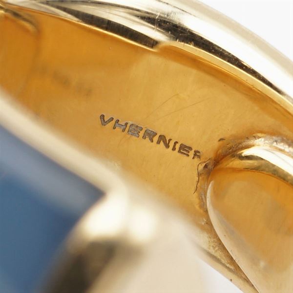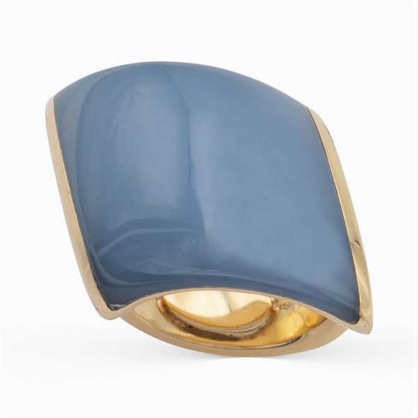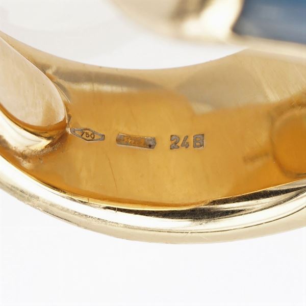 peso 32,5 gr.in oro giallo 18kt con sezione geometrica in calcedonio azzurro, firmato e numerato n. 248 all'interno del gambo, misura 15