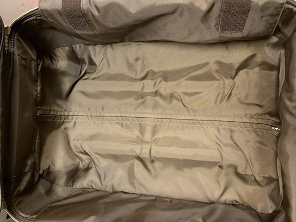 50x35x18 cmin tela Monogram con finiture e manico in pelle, chiusura con cerniera doppio cursore, tasca frontale con zip, scomparto interno in fodera poliammide con due pattelle, due tasche con zip, completo di targhetta portanome, una ruota con difetti