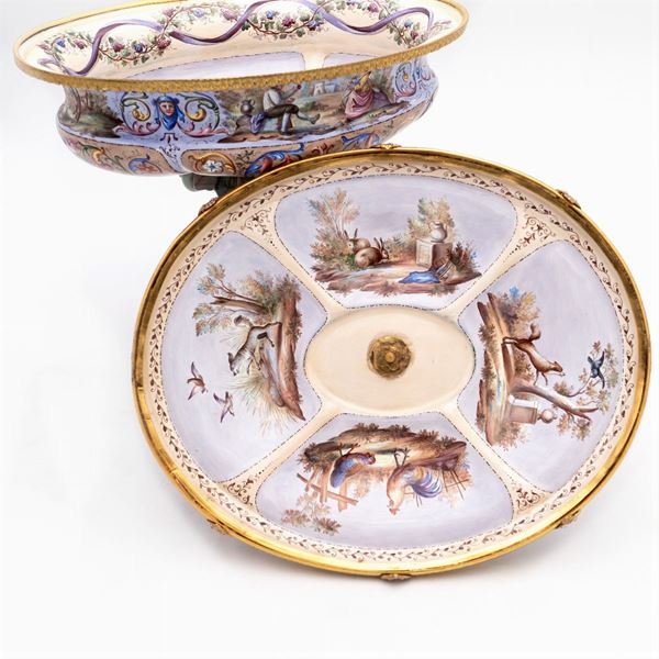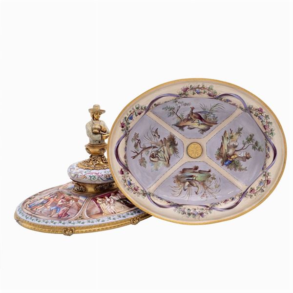 32x21x17 cm.corpo ovale decorato con scene di vita popolare e volute vegetali, presa del coperchio a foggia di personaggio maschile
