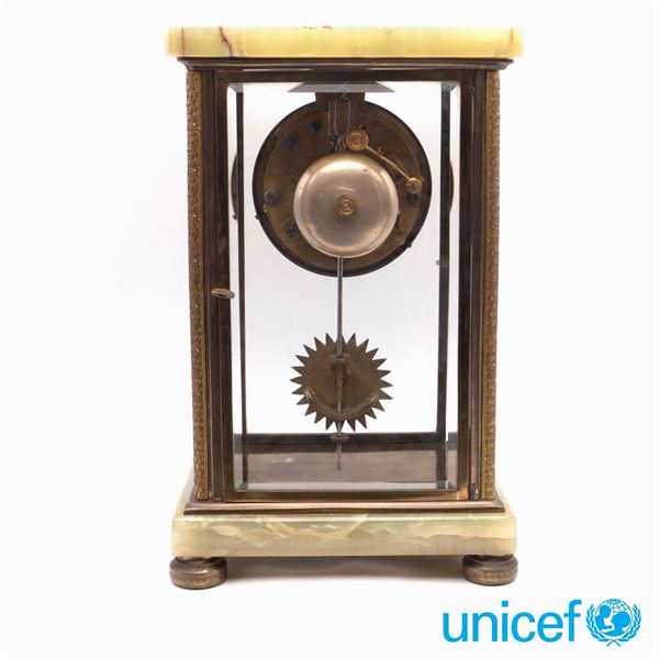 28x17,5x13,5cm.struttura architettonica con finiture in bronzo dorato, quadrante circolare in smalto, pendolo e chiave di carica presenti