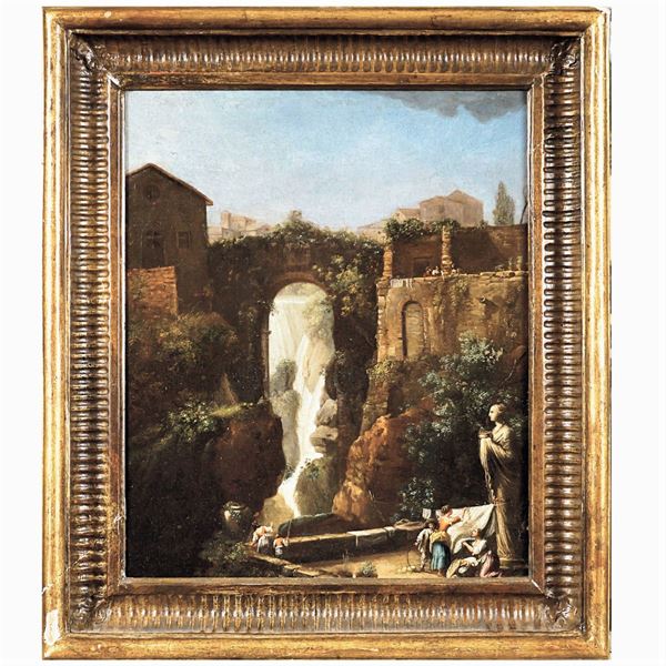 44x36 cm."Cascate di Tivoli", olio su tela, entro cornice in legno dorato