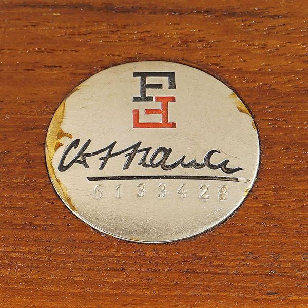 sei sedie mod. 203, legno di teak e vinilpelle, etichette della produzione