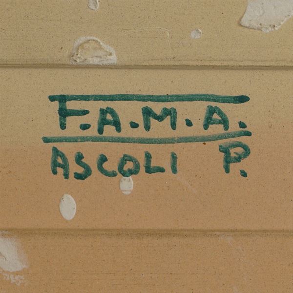 15x15 cm.quattro mattonelle in ceramica policroma, entro cornici in legno, marchio della produzione