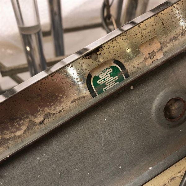 100x130x40 cm.lampada a sospensione in metallo cromato e perspex, etichetta della produzione