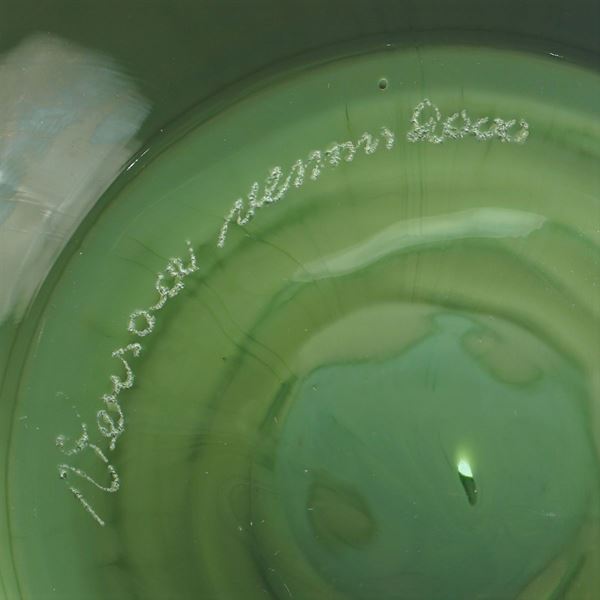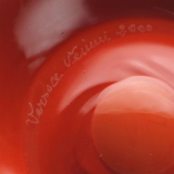 22,5-20 cm.coppia di vasi in vetro ad incalmo nei colori arancio e verde con inclusioni in oro, firma a punta Versace Murano 2000, etichette della produzione