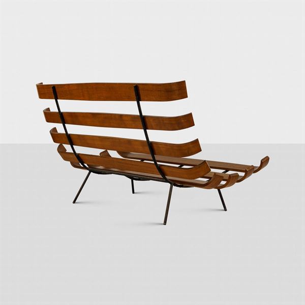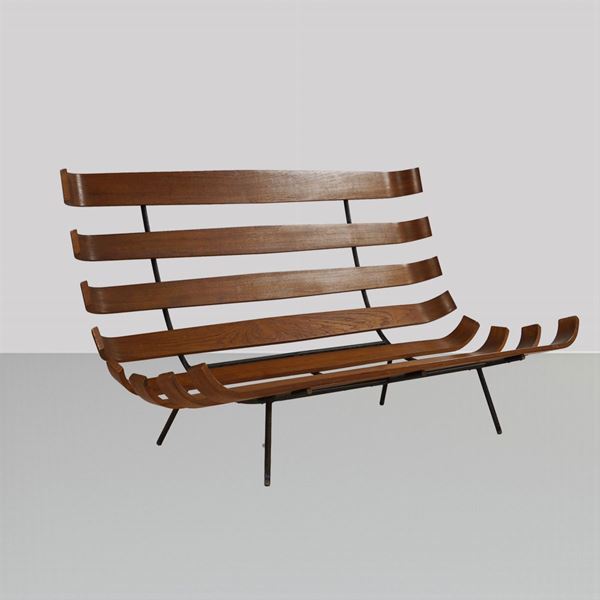 80x140x90 cm.divano mod. Costela, ferro laccato, legno incurvato e tessuto imbottito, usure