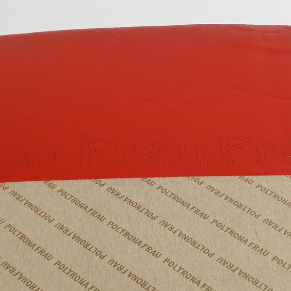 75x205x94 cmdivano mod. Eskilo, pelle rossa imbottita e legno, marchio ed etichette della produzione, usure