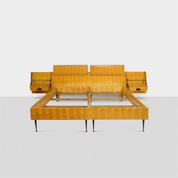 letto 105x300x200 cm. - cassettiera 120x190x49 cm. - armadio 186x300x65 cm.camera da letto composta da un mobile cassettiera con specchio, letto con testata e due comodini pensili, un armadio, in legno, ottone e vetro.