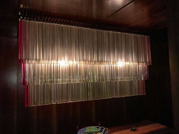 lampada a sospensione serie Trilobo, vetro rosso, trasparente e ottone
