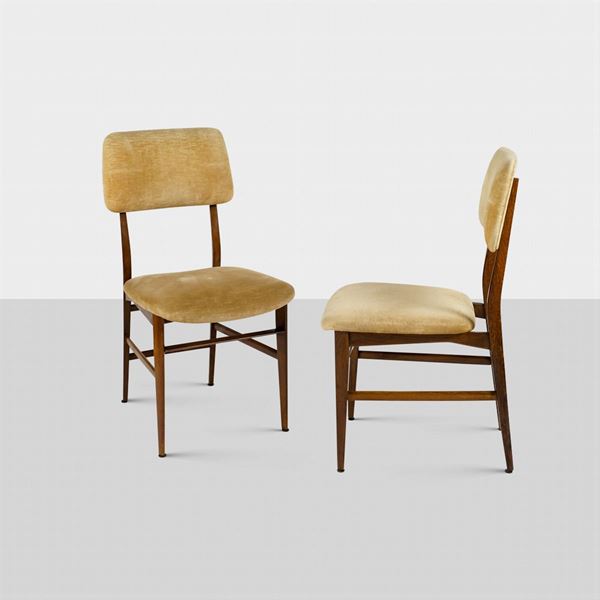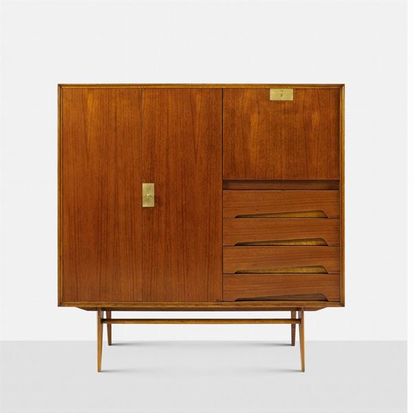 tavolo 79x160x85 cm. - sideboard 90x265x46 cm. - highboard 125x125x46 cm.sala da pranzo composta da un sideboard, un highboard, un tavolo allungabile e sei sedie, legno, ottone e tessuto imbottito