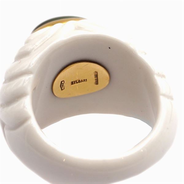peso 9 gr.in ceramica e oro giallo 18kt centrato da un peridoto taglio cabochon, misura 11
