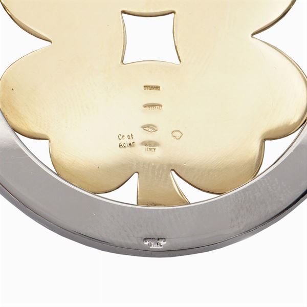 peso 40 gr.in oro giallo 18kt e argento, completo di laccio originale in cuoio con chiusura in argento firmata, misura grande, diametro 4,3 gr.